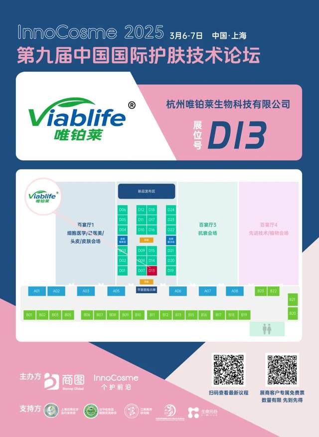3月6-7日,唯鉑萊將以展商的身份亮相InnoCosme 2025第九屆中國國際護膚技術論壇,展位號D13。
